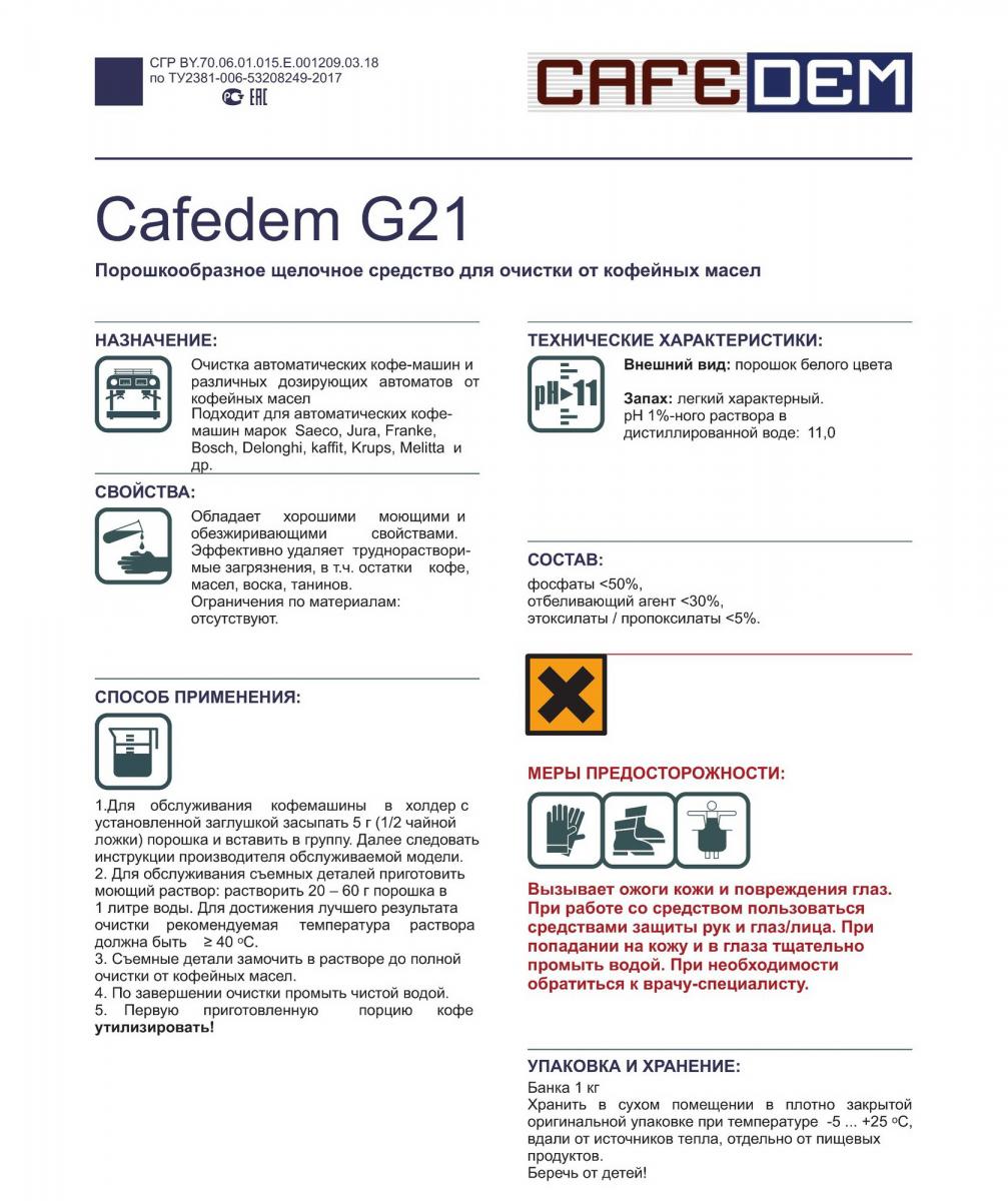 Получить информацию об условиях поставки товара "Средство для чистки кофемашин Cafedem G21" Вы можете позвонив нам по телефонам:
